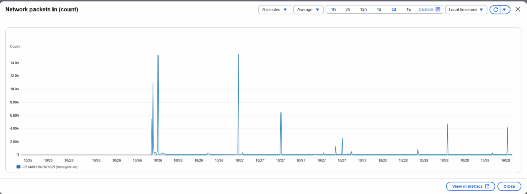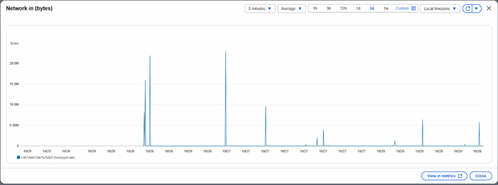 Stockholm honeypot CloudWatch metrics showing modest traffic spikes but no sustained attack campaigns.