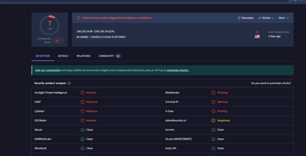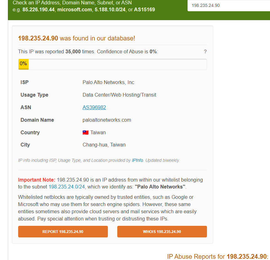 - IP 198.235.24.90 (Palo Alto Networks): 0% AbuseIPDB score but 35,000 reports.