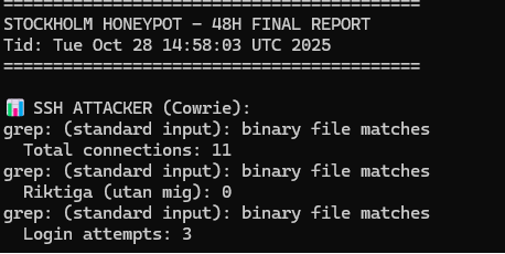 Stockholm honeypot received 0 SSH attacks from external sources over 48 hours. The 11 total connections shown are from testing during deployment – all real attack attempts = 0.
