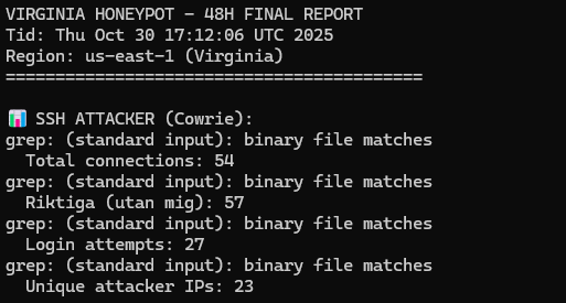 This cybersecurity research project deployed identical SSH honeypots in two AWS regions—Stockholm (eu-north-1) and Virginia (us-east-1)—to analyze regional differences in cyber attack patterns. Over a 48-hour period, the Virginia honeypot attracted 8 times more unique attacker IPs (482 vs 60) and received infinite more SSH connection attempts (57 vs 0) compared to Stockholm.