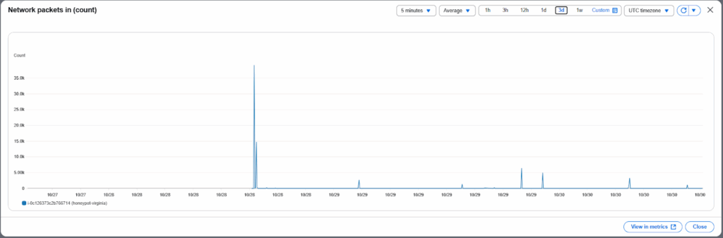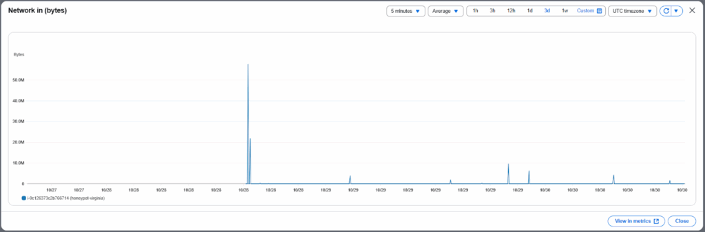 Virginia honeypot experienced significantly higher traffic with multiple distinct attack waves visible on October 28th, 29th and 30th.