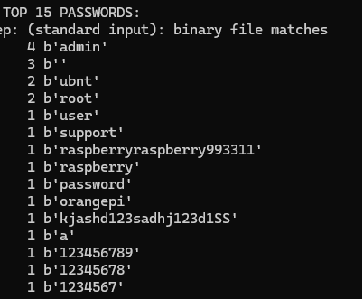 - Password attempts focused heavily on IoT device defaults (ubnt, raspberry, orangepi).
