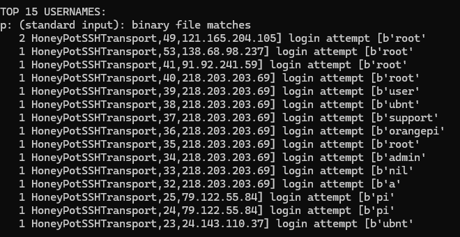 Username analysis shows ‘root’ dominated with 5 attempts, followed by ‘pi’ and ‘ubnt’.