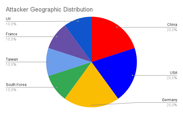 Geographic distribution of SSH attackers: China (20%), USA (20%), Germany (20%), with smaller percentages from South Korea, Taiwan, France, and UK.