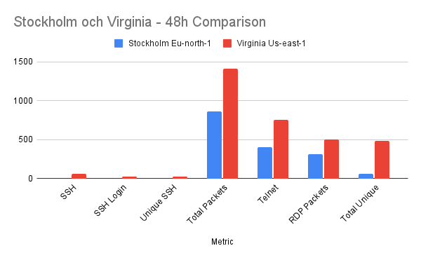 Comparative analysis of attack patterns: Stockholm (EU North) vs Virginia (US East) over 48 hours.